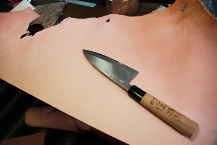 まずは革に包丁を合わせて、実寸を計りながらどう切り抜くか決めます。