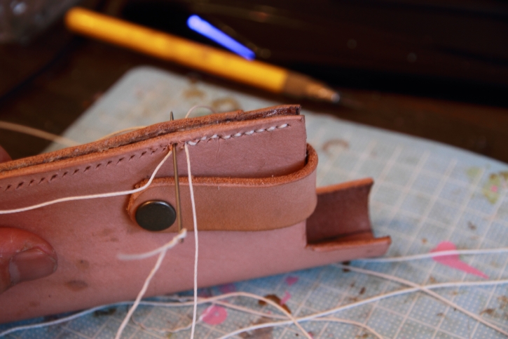 革の縫い方は、まずはじめに穴をあけて糸を通していく感じ。特に器用さはいりません。