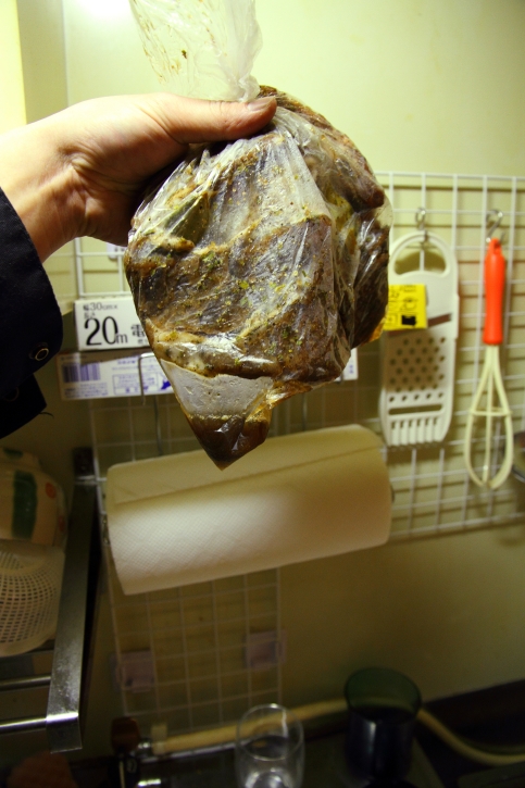 で、袋に全部入れたらお肉をモミモミします。おっぱいのように優しくかつ丁寧にねちっこく揉みしだきます。これ重要。