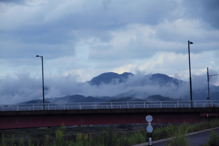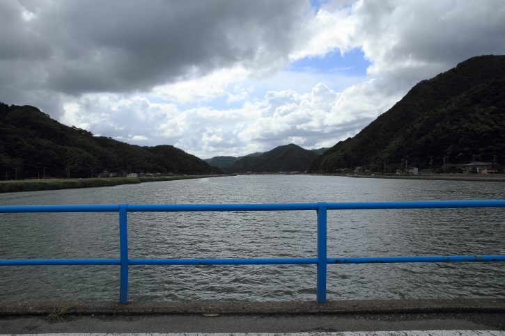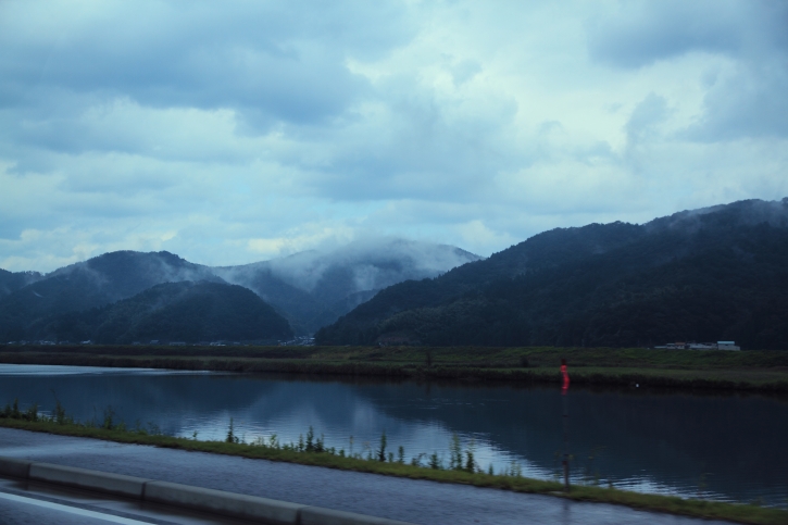 円山川。天気が悪かったので残念っちゃ残念ですが、山にかかる雲はきれいだったのでまあいいか。