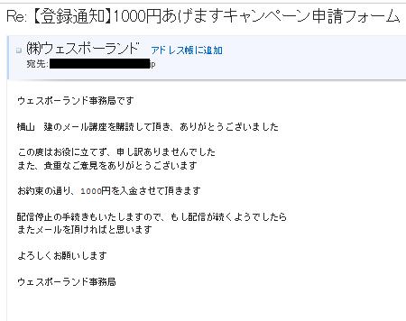 フォームから1000円くださいと送信してから数日後。
