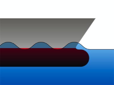 このため、水面で船首が水を掻き分けて生じる波は、バルバス・バウによって生じた波とは逆位相となり、それぞれの山と谷が打ち消しあうことで波を小さくする。