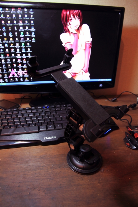 僕が普段使ってるモニタのサイズとか場所とかの兼ね合いで、横置きはバランス悪いので縦にしたいので、車載用のタブレットホルダーにはさんで使ってます。